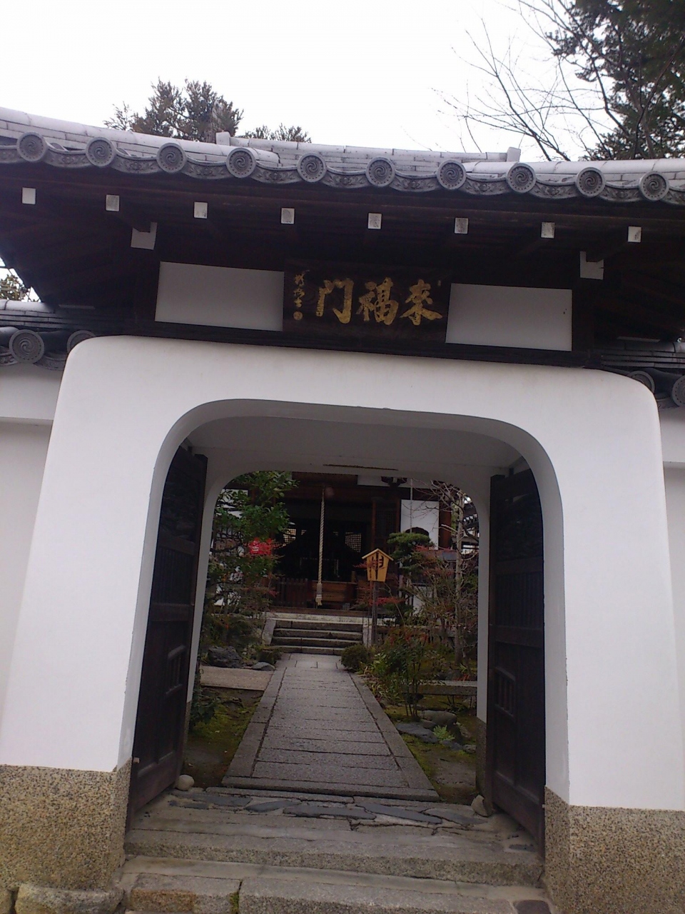 世界遺産の天龍寺は足利尊氏が後醍醐天皇を慰霊するため、夢想国師を開山として建立した臨斉宗のお寺です。東門から参道を歩いて行くと、飛天観音の次に参道の右側にあります。白壁の竜宮城のような来福門がとても目立っています。天龍寺の塔頭寺院の一つです。天龍寺七福神の一つ、水摺大弁財天を祀っています。