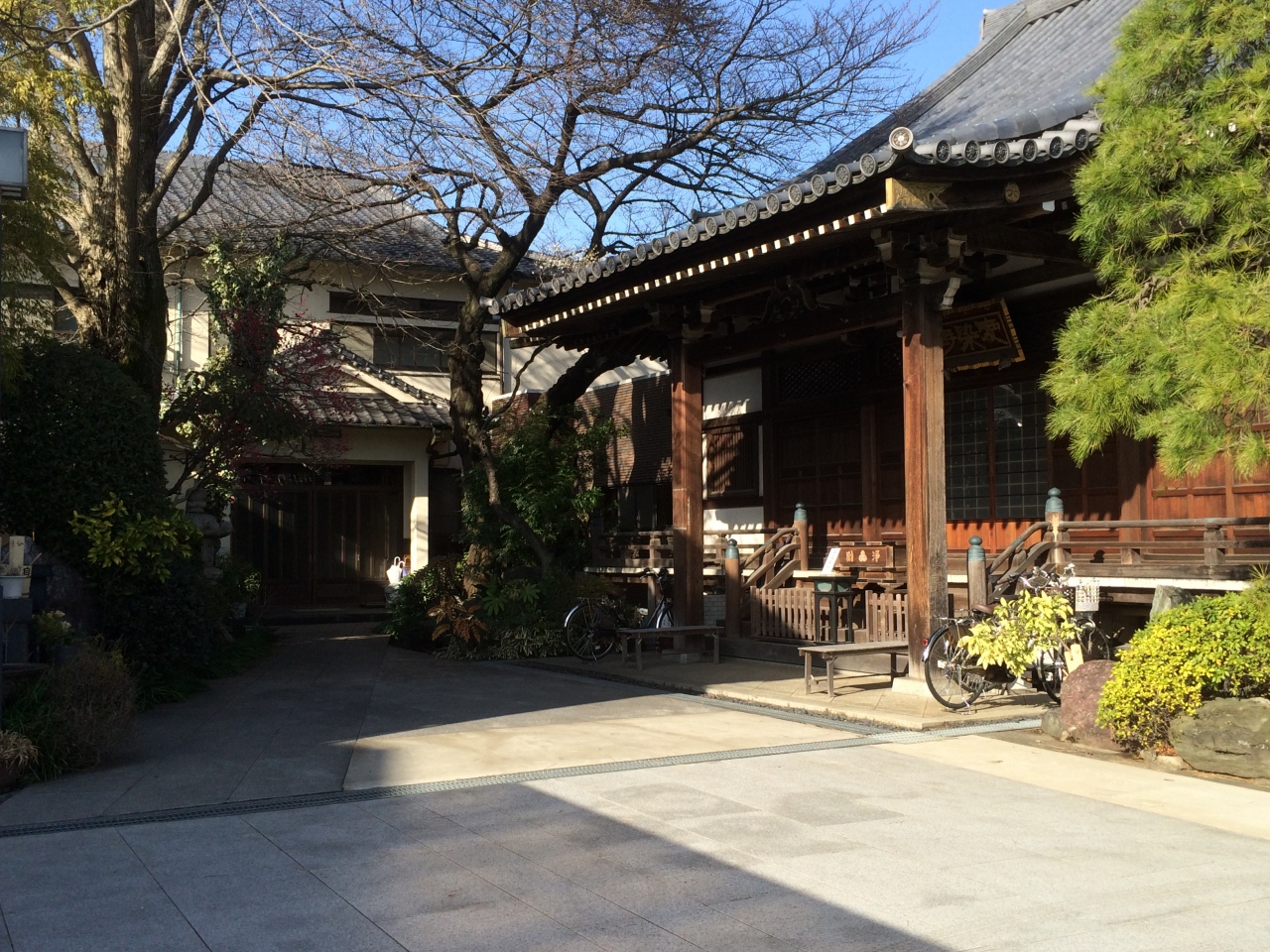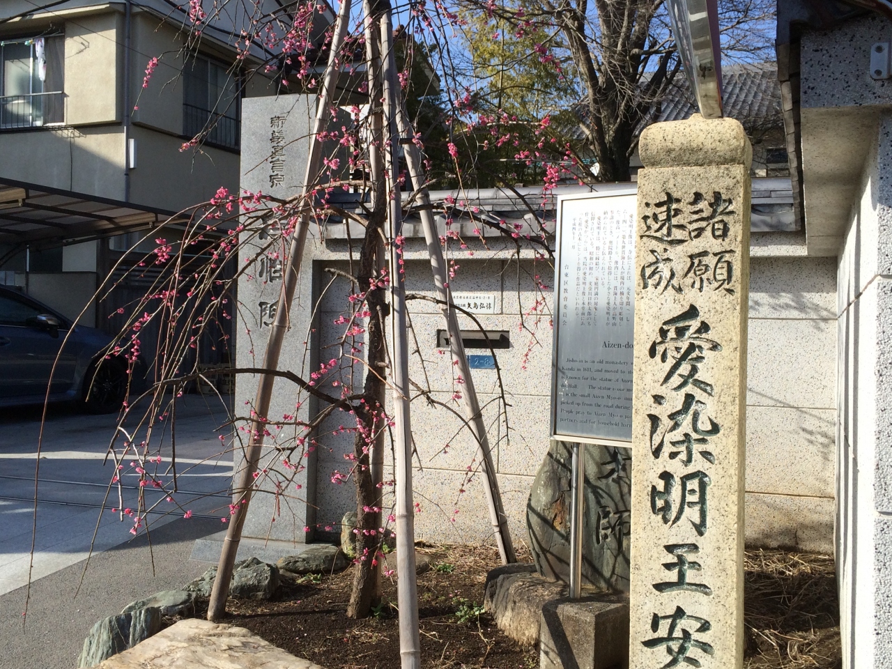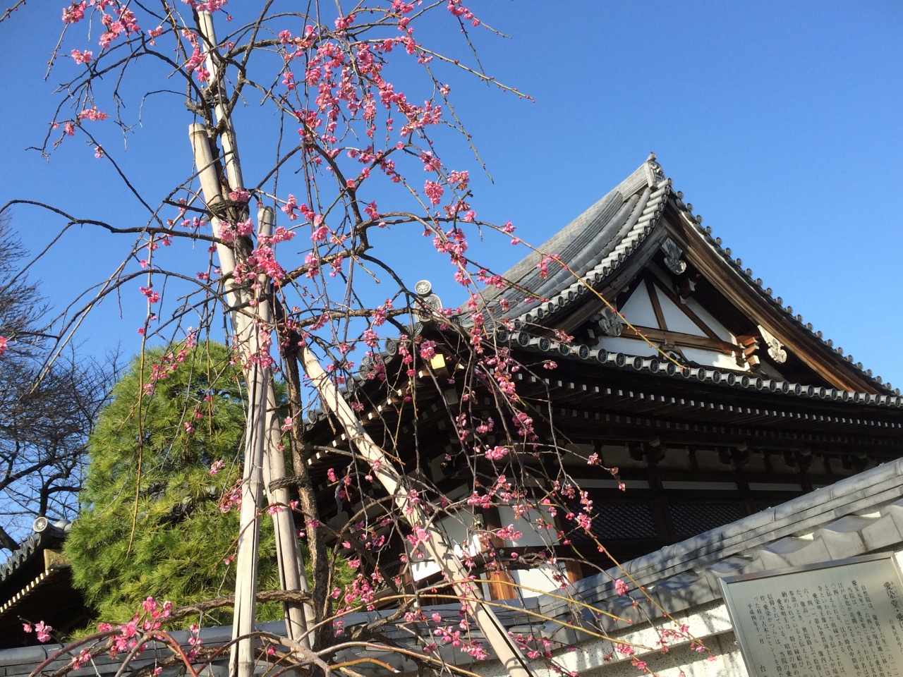 このお寺は塀越しに咲く大きな枝垂れ桜が見事なのですが、春浅いこの日は、去年にでも植えられたかのような、か細い紅梅が健気に花を咲かせていました。