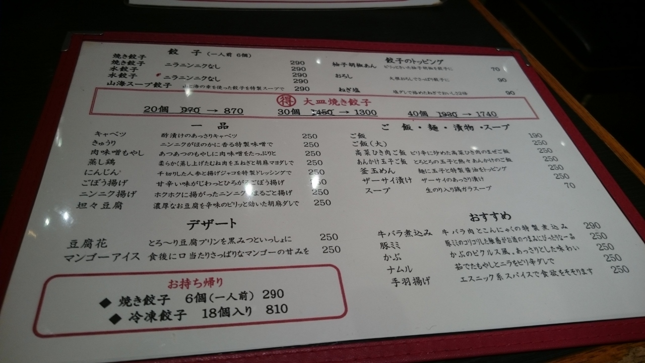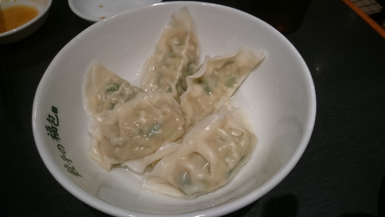 新宿三丁目駅と新宿御苑前駅の間くらい、新宿通り沿いにある餃子専門店。お店は、カウンターとテーブル席で、日曜日の14時半過ぎにいきましたが、少し待ちました。ランチが安いと聞いていたのですが、既に終わっていました。しかし、焼餃子も水餃子も1人前290円(6個)ですからかなりリーズナブル。大皿のほうがお得とのこと。そこで大皿焼き餃子30個と20個を注文(二人で行きました)。サイドメニューも安く、他の食べたかったけど、今回は我慢。このほかご飯とスープ(70円)を注文。焼餃子は王将に比べて大きくないので、意外とたくさん食べられます。餃子は野菜ベースの餡で、皮はパリパリで、餡もジューシー過ぎず丁度よく、ぱくぱく食べられます。結局、水餃子も一人前追加。餃子の大きさは焼餃子と変わりませんが、食感が全く異なり、モチモチしています。生のり入りの鶏ガラスープは、生のりの香りがよく、餃子にフィットしました。平日、土曜日は朝までやっているようです。今度は夜、ビールを飲みながら行きたいです。