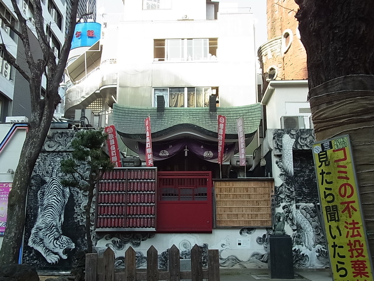 JR新宿駅東口から徒歩10分くらいでしょうか。歌舞伎町の中のアダルト系のエリアにあります。ココの弁天様は、もともと仏教が生まれる以前に衆人の信仰を集めた宇賀神と称する天地創造の神様の一人で、仏教の守護神として崇がめられた尊神です。両脇の”龍と虎”に凄みを感じますが、たしか以前は無かったような?
