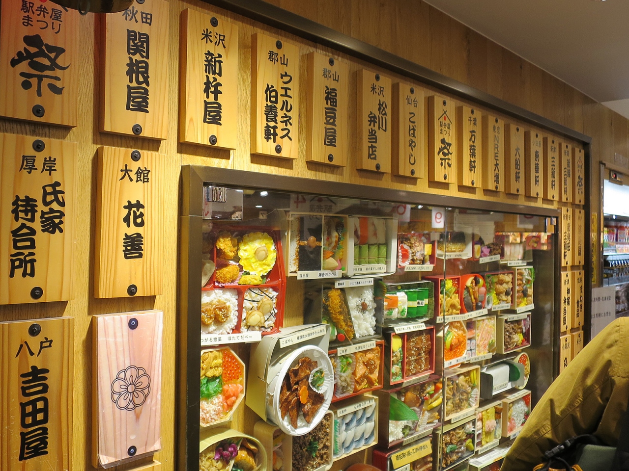 - 壁面には各駅弁のサンプル!店内には2か所にライブキッチンがあって、作り立てを食べられることもありますが、恒常的な激混みが…