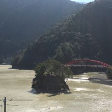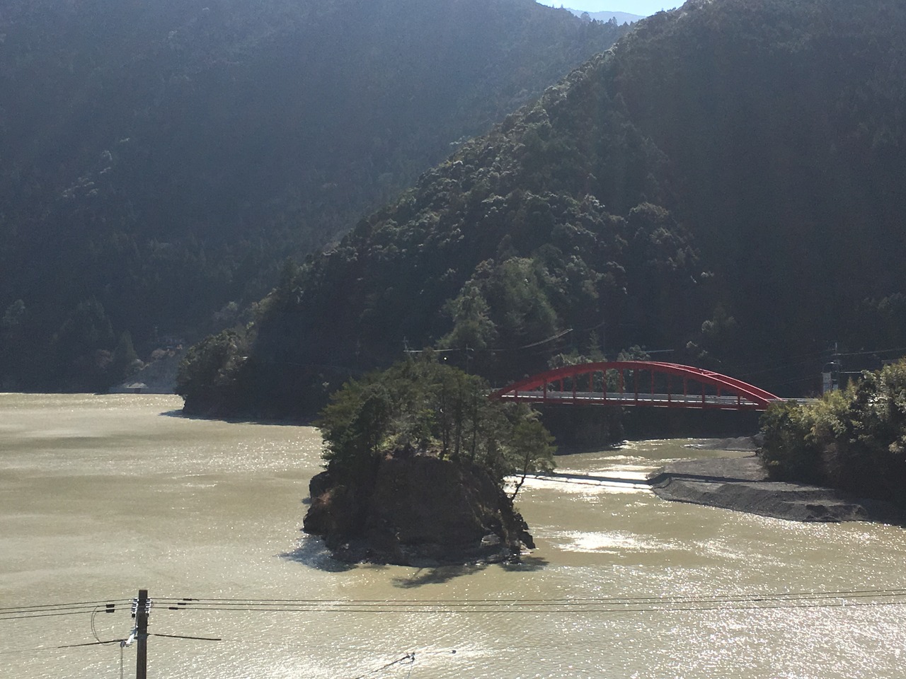 二津野湖にかかる赤い橋と湖畔の温泉がまさに十津川温泉のイメージで、パンフレットにもあります。五条方面から国道168号線沿いに走ると、十津川温泉バス停を超えたあたりの風景です。ちょっと霧がかかり、湖畔がもやっている時が最高です。