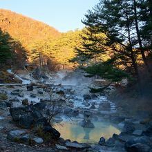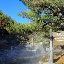 一帯は溶岩がゴロゴロ転がり、あちこちから温泉が湧き出し湯の川となって流れ出し、湯溜まりが点在、湯気がもうもうと上がり荒涼としています。