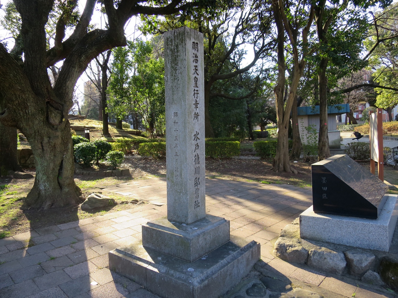 「隅田公園」の墨田区側、その一番北側の端は、かつての水戸徳川家下屋敷跡で、その一角には「明治天皇行幸所 水戸徳川邸舊阯」という碑が建てられています。このページでは「水戸藩下屋敷石碑」となっていますが、屋敷は藩に与えられるものではなく各家に与えられたものなので、この”水戸藩下屋敷”という表現は正しくはなく、この碑も「水戸徳川邸舊阯」という表現になっています。また、この碑は明治天皇が行幸されたことを示すものですから、横には明治天皇が詠まれた歌を刻んだ「明治天皇御製碑」があります。