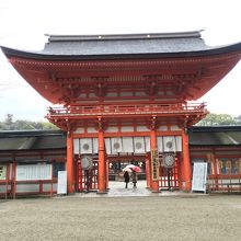 下鴨神社の参道のつきあたり、神殿などの建物の手前にある門です。本殿などは特に色が無い木造建物ですが、これは朱色に塗られているので、こちらの方を本殿と間違ってしまいそうです。それでも、最近のものではなく、江戸時代にできたものだそうて。素晴らしいです。