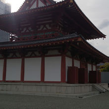 四天王寺の中心施設。広い四天王寺の境内は東西南北に複数の山門があって境内に入りますが、いずれから入っても、その中心に中心伽藍があって、さらにその中心にこの金堂があります。拝観するのは有料ですが大人300円ですし、講堂なども見学できますのでコスパは悪くないと思います。金堂ですが外観は瓦屋根に朱色に塗られた柱、梁、白色の壁となっており、金色はないです。見どころはご本地仏である救世観音と内壁に描かれた仏伝図で凛とした雰囲気の中で見ていると落ち着きます。土曜日の午後の訪問でしたが人でごった返すこともなく、落ち着いて参拝できました。