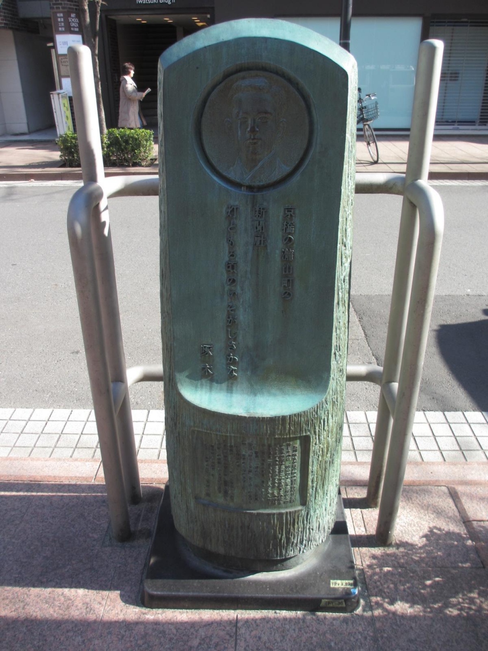 銀座並木通り、6丁目の朝日ビル(現在工事中です)の前銀座4丁目の方を向いて左側の歩道に緑色っぽい石川啄木の歌碑があります。「京橋の瀧山町の 新聞社 灯ともる頃のいそがしさかな」。啄木のイメージと現在の並木通りはマッチしないと思ったのですが、当時この場所にあった朝日新聞社で構成の仕事をなさっていたということで納得しました。
