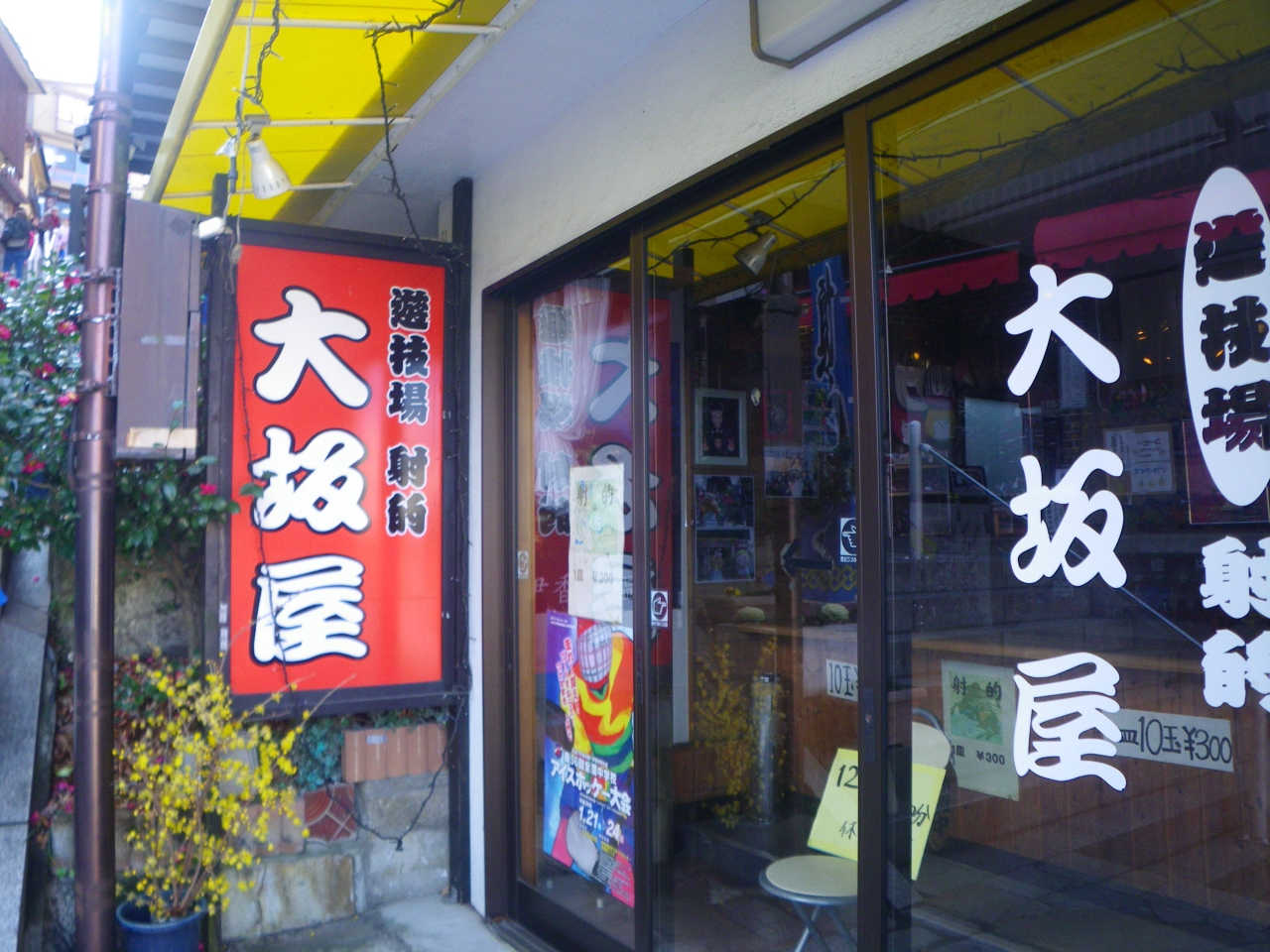 石段街の中腹にある射的屋さんです。昼頃でしたが休憩中の看板が出ていました。伊香保温泉には射的や輪投げあそびなどができる遊技場が多数ありますが、訪問時の平日昼間は営業していない遊技場ばかりで残念でした。