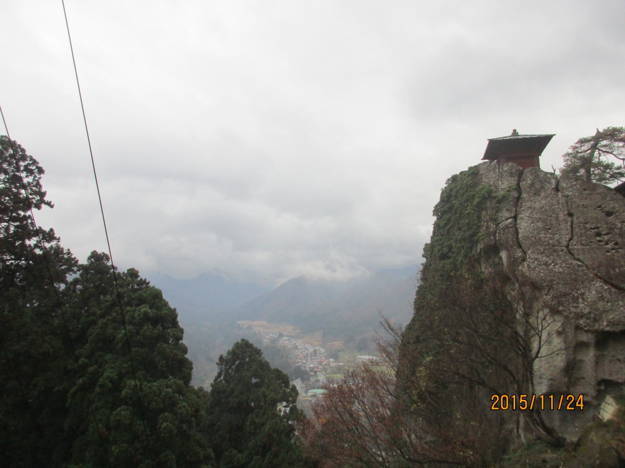 雨の中、山寺の駅や街の絶景を見下ろし、また山寺の境内の奇岩や建物を見ることができる場所で、山寺に行ったら必見です。登り切ったら短い石段があり展望台を見落としてしまうところでしたので要注意です。
