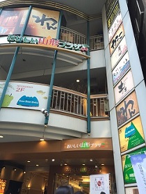 山形のアンテナショップです。何かおいしそうなものはないか、珍しいものはないかと中に入りました。お店の前には野菜があり、店内はお漬物からお酒、お菓子など色々なものが売られています。玉こんにゃくの串刺しが美味しそうでした。