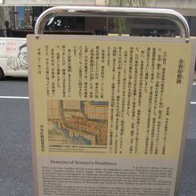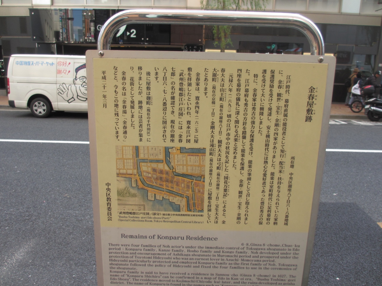 御門通りを歩いて行くと中央通りに向かって左手に説明板が立っています。場所は金春通りと合流する場所から少し外堀通り寄りです。金春家は江戸時代能楽の筆頭だったそうです。説明板が残っているだけなので、あまりイメージが湧かないのが残念です。