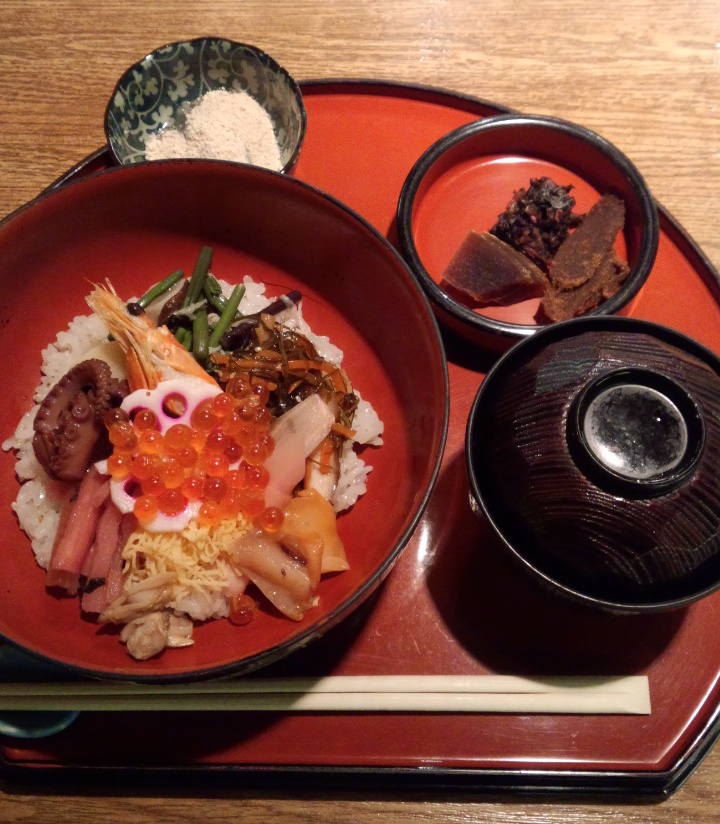 こちらのお店は和食屋さんで、手頃な価格の花御前というちらし寿司と吸い物と漬物とわらび餅が付いたセットにしました。