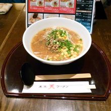 第2ターミナル1階の到着ロビーにある「東京ラーメン天」で食事しました。店内入ると右側にテーブル席へ案内されました。シンプルな天ラーメンと餃子を注文。非常に残念な感じがしましたが、ラーメンのお味は普通です。価格の割にがっかりしたのは私だけでしょうか。おそらく再訪はしないと思いますが、お水は冷えていてスタッフも好感が持てました。