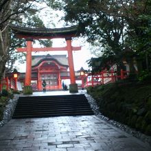 本殿の前の勅使門という名もある西大門の前にある鳥居です。緑の中の石段を登って行くと、この鳥居が見えてきて、さらにこの鳥居の向こうに西大門が見えて来ます。この鳥居は宇佐古来の形式をもつ鳥居として有名で、台輪を柱上に置いています。