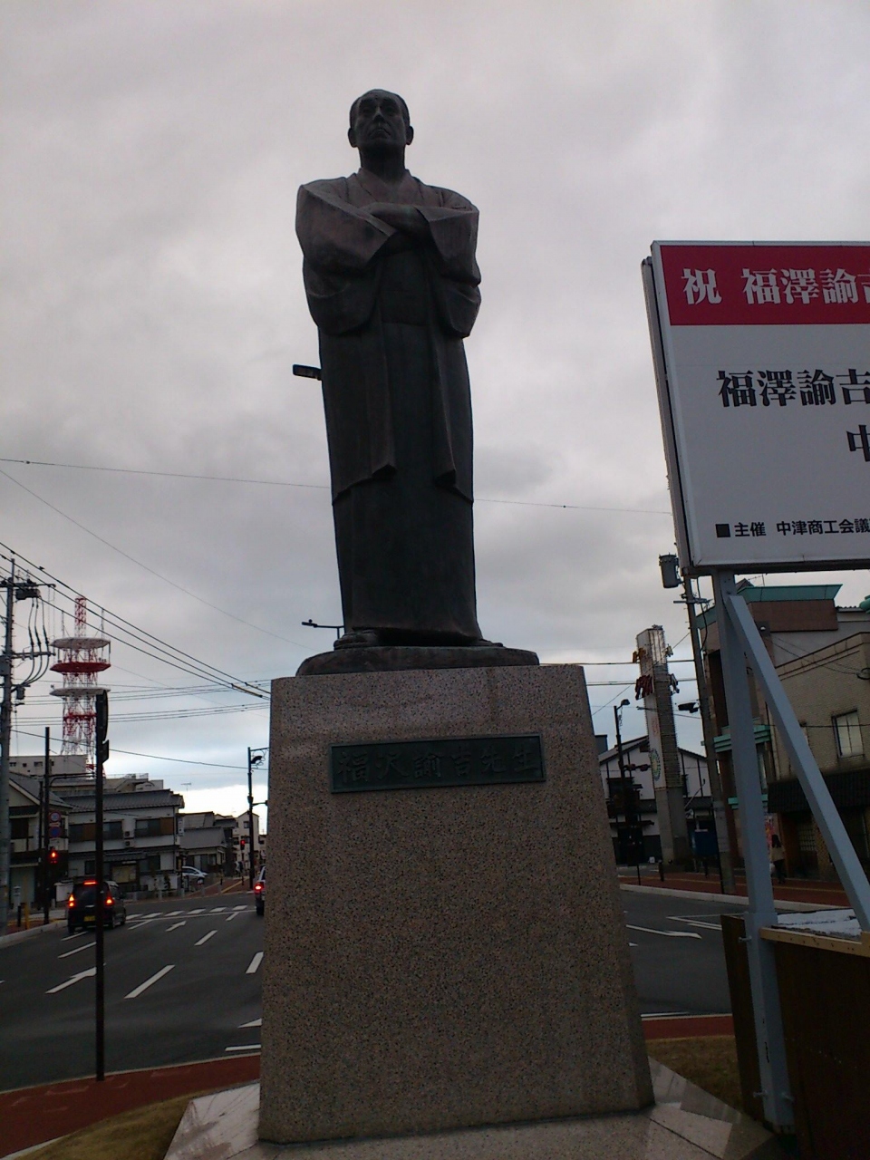 中津駅から寺町を通って中津城へ向かおうとして、中津駅の北口を出ると目の前に、この福沢諭吉の銅像が建っていました。着物姿で腕を組んだ姿の銅像です。福沢諭吉の生まれ故郷がここ中津だとは、中津に来るまで知りませんでした。
