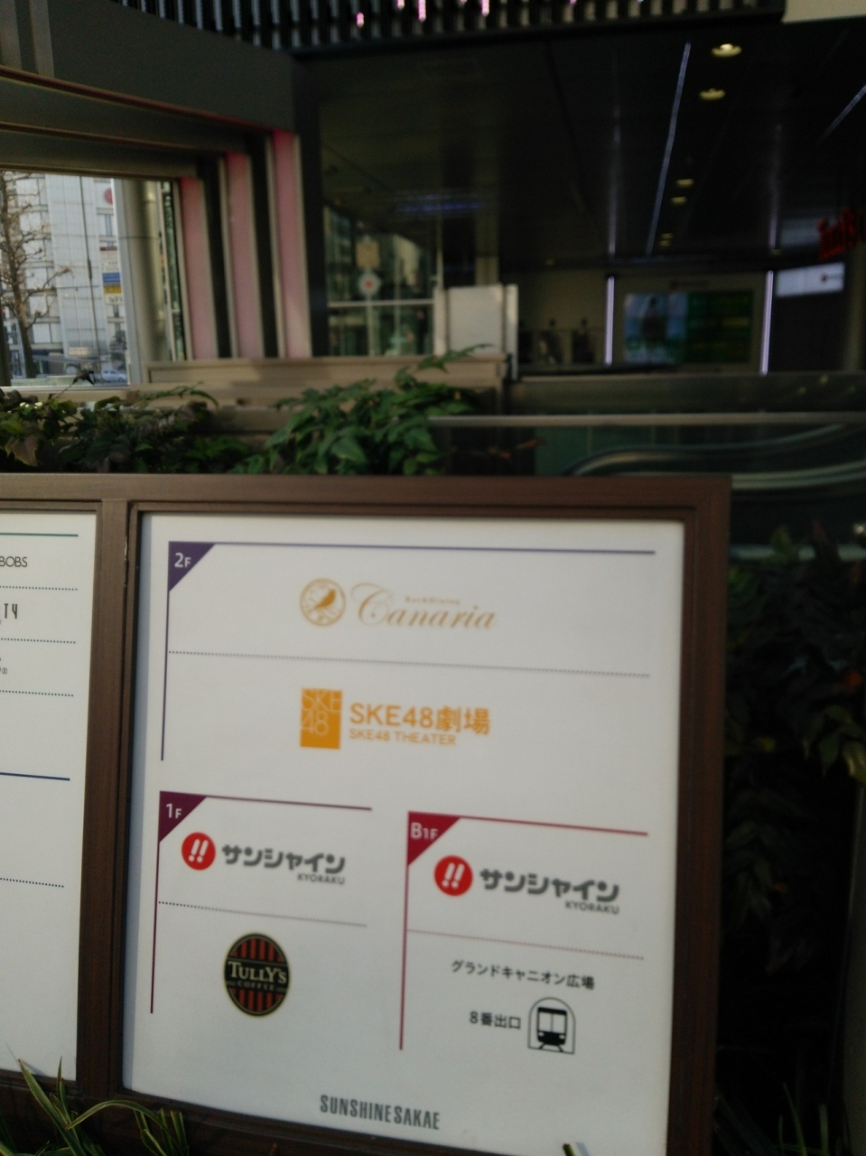 名古屋のアイドルグループ「SKE48」の活動拠点であるSKE48劇場は、栄のど真ん中、観覧車のあるサンシャインサカエの2階にありました。時間が合わなかったため、営業はしていませんでしたので、今回は外観だけ見てきました。