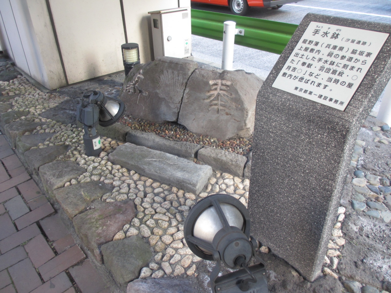 昭和通り銀座歩道橋 (ときめき橋)の階段下は全部で4ヶ所ありそれぞれに展示がありますが、こちらの手水鉢は、歩道橋の北西つまり銀座8丁目で中央通り寄りにあります。龍野藩(兵庫県)脇坂家の上屋敷の祠の参道から出土したそうです。ライトアップの設備まであるのですからもう少し丁寧な解説をつけていただきたいと思いました。