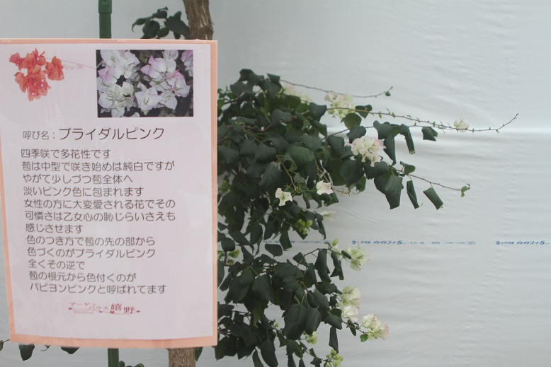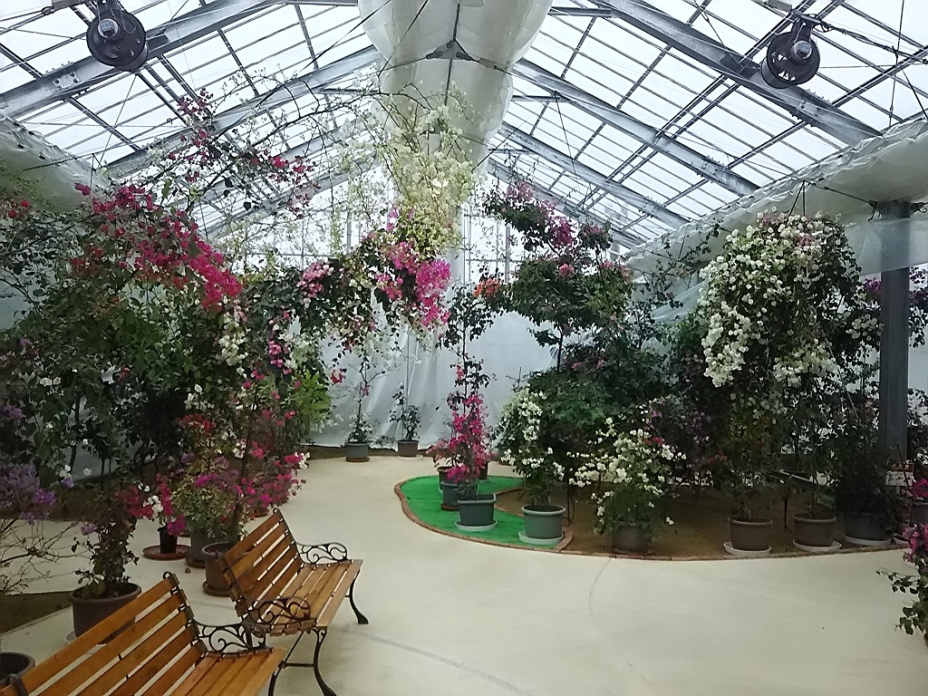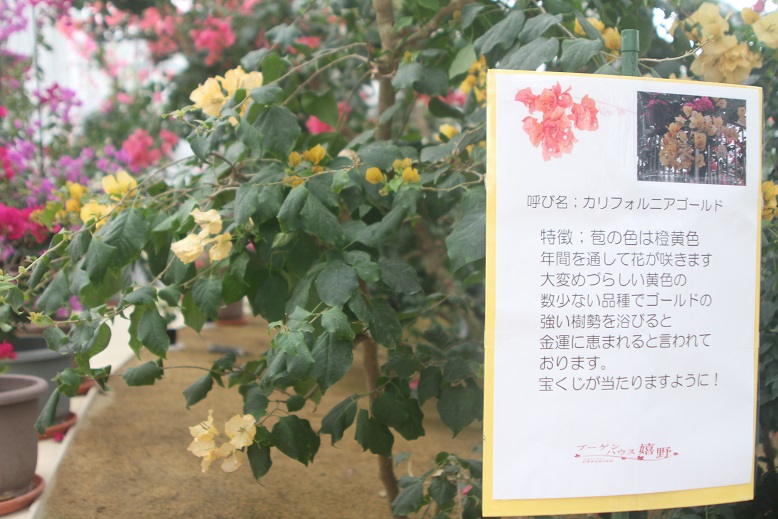 スタッフさんの話では、20種175本のブーゲンビレアを育ててあるそうで、嬉野温泉は盆地のため冬には降雪もあって、ハウス内の温度管理が大変だということでした。