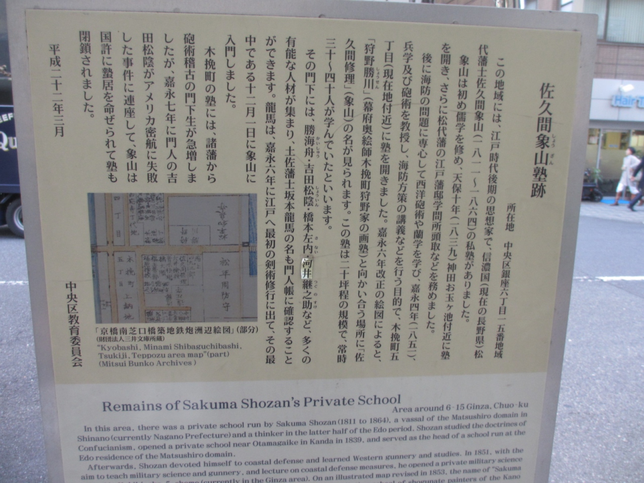 昭和通りに面した電源開発のビルの横を築地に向かってみゆき通りに入ってすぐ右手に説明板が立っています。佐久間象山の私塾がこのあたりにあったそうですが、今は何の面影もなくただ説明板が立っているだけでした。