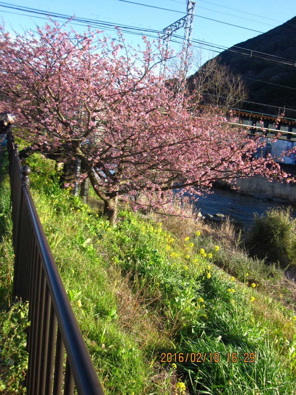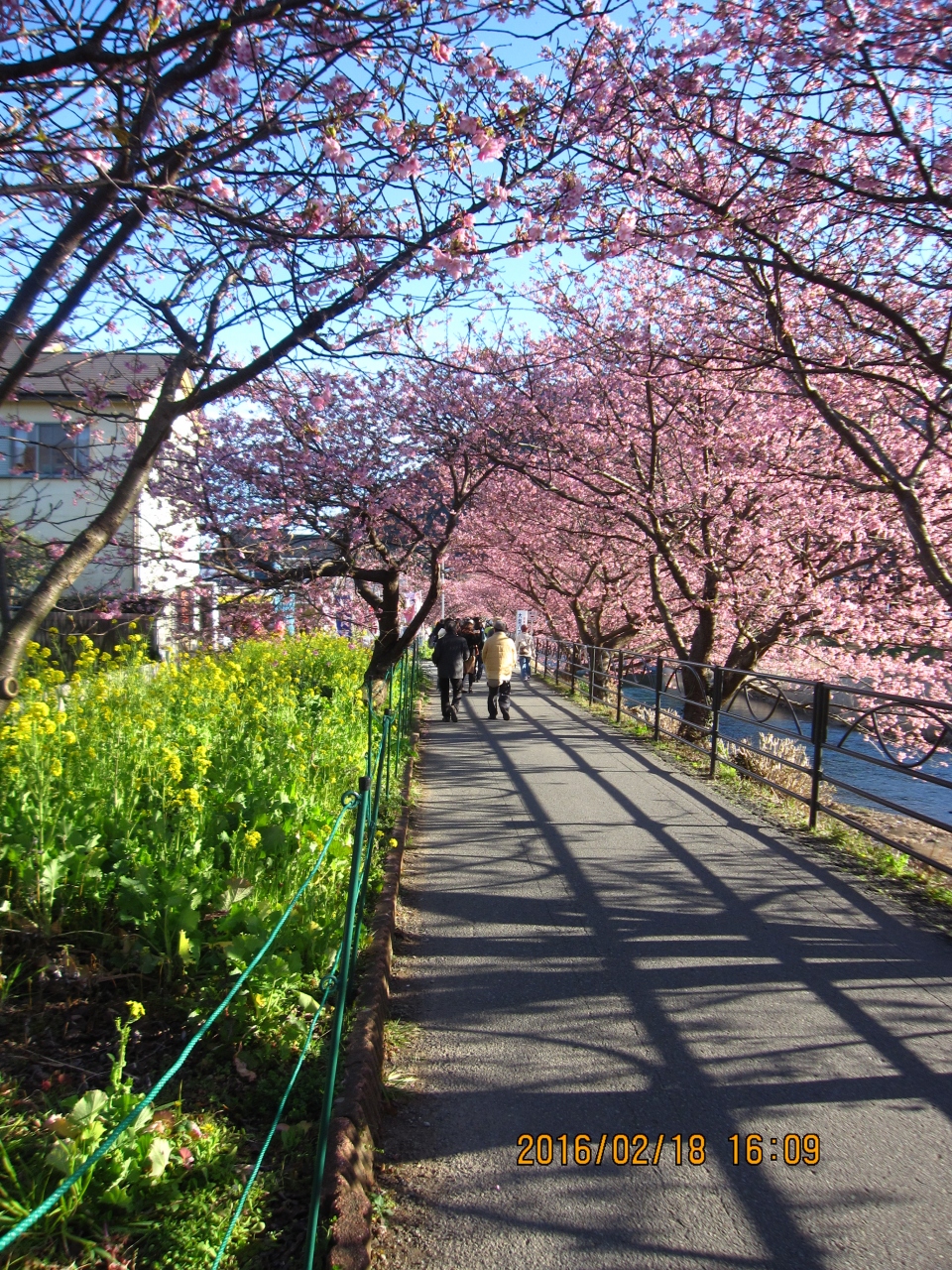 一度は行って見たい所だったので ツアーで参加しました。丁度満開で心ウキウキ楽しみました。ただ見学時間が1時間ちょっとだったのであせりました。端から端まで歩いてみたかったのです。空は青く ピンクの桜の花のトンネル 幹元には 黄色い菜の花がびっしりと言いたい所ですが 菜の花は想像していたより少なかったです。でもでも満開のトンネルが見れて最高でした。道端のお土産物屋さんも 河津桜の苗 桜花のパッケージのお菓子 ジャムと色々で つい覗き込んで買い求めました。