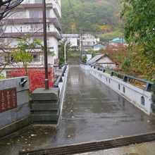 水上温泉の中心街にある湯原温泉公園の東側の諏訪峡に水上橋があります。橋の上からは両サイドに紅葉に染まる水上峡の絶景が見られました。橋は車1台が通れる広さで、東側に行くと線路を渡って抜けられますが、道幅が狭く大きな車では渡らない方が無難です。