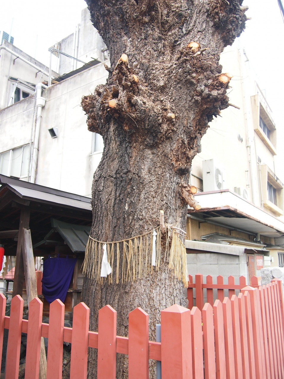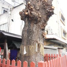 かつての島原住吉神社(しまばらすみよしじんじゃ)の境内にあった銀杏の御神木だったそうです。さすがに御神木を切る事は出来なかったみたいでいまは家と家に挟まれています。住吉神社はもともと住吉屋太兵衛宅にあった個人宅の住吉大明神が始まりだそうです。