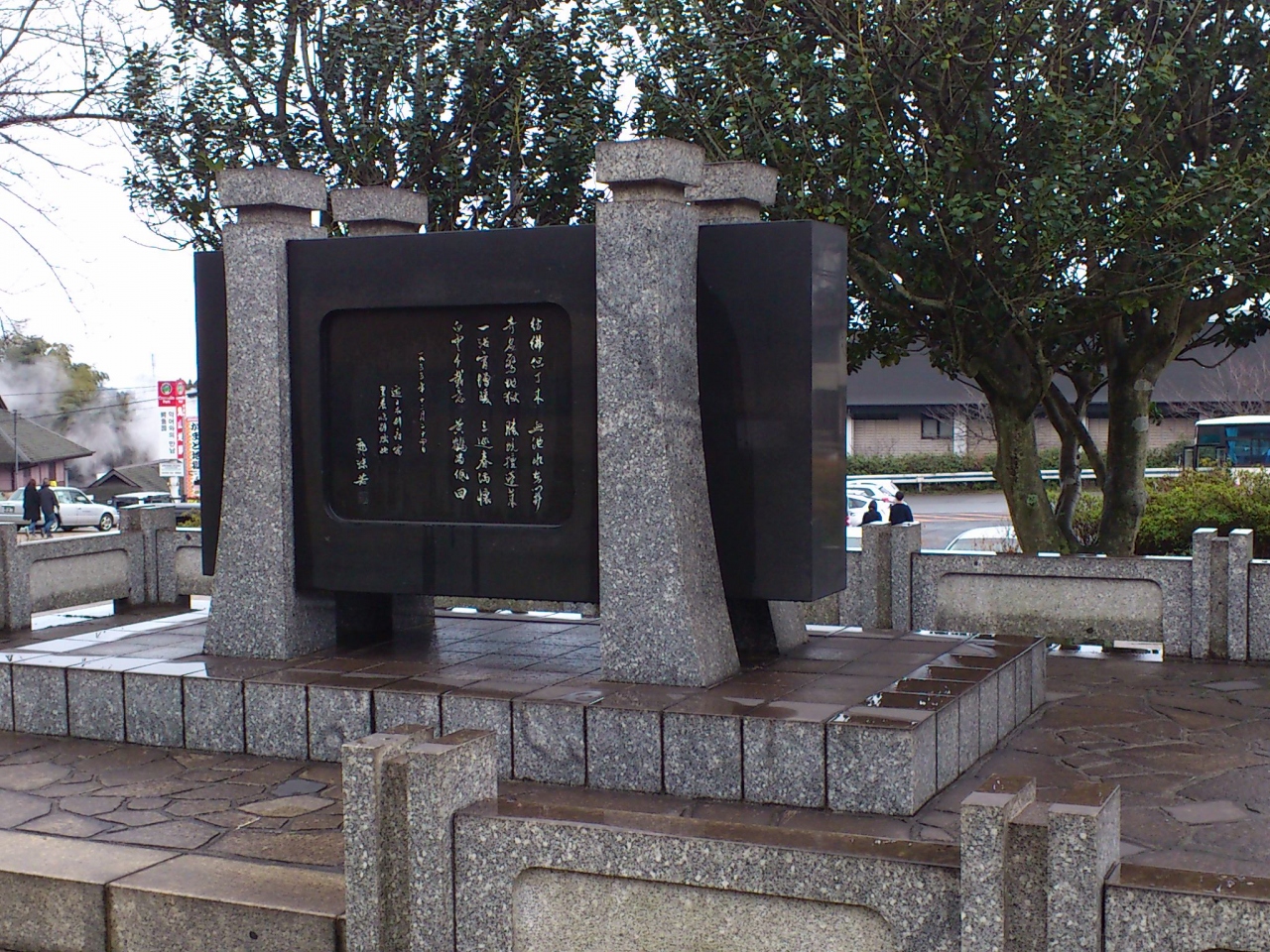 郭沫若は中華民国の政治家、文学者、詩人、歴史家で、青年時代10年間日本に留学していたそうです。海地獄、かまど地獄の近くにある十万地獄公園の中にある詩碑です。ほうふとしてダンテ来る、血の池の水たぎるあり、奇名地獄に驚き勝境逢菜をほしままにす。一浴すれば宵暖を増し、三巡すれば春ふところに満つ、白雲千載の意、黄鶴低回をなす、と書いてあります。