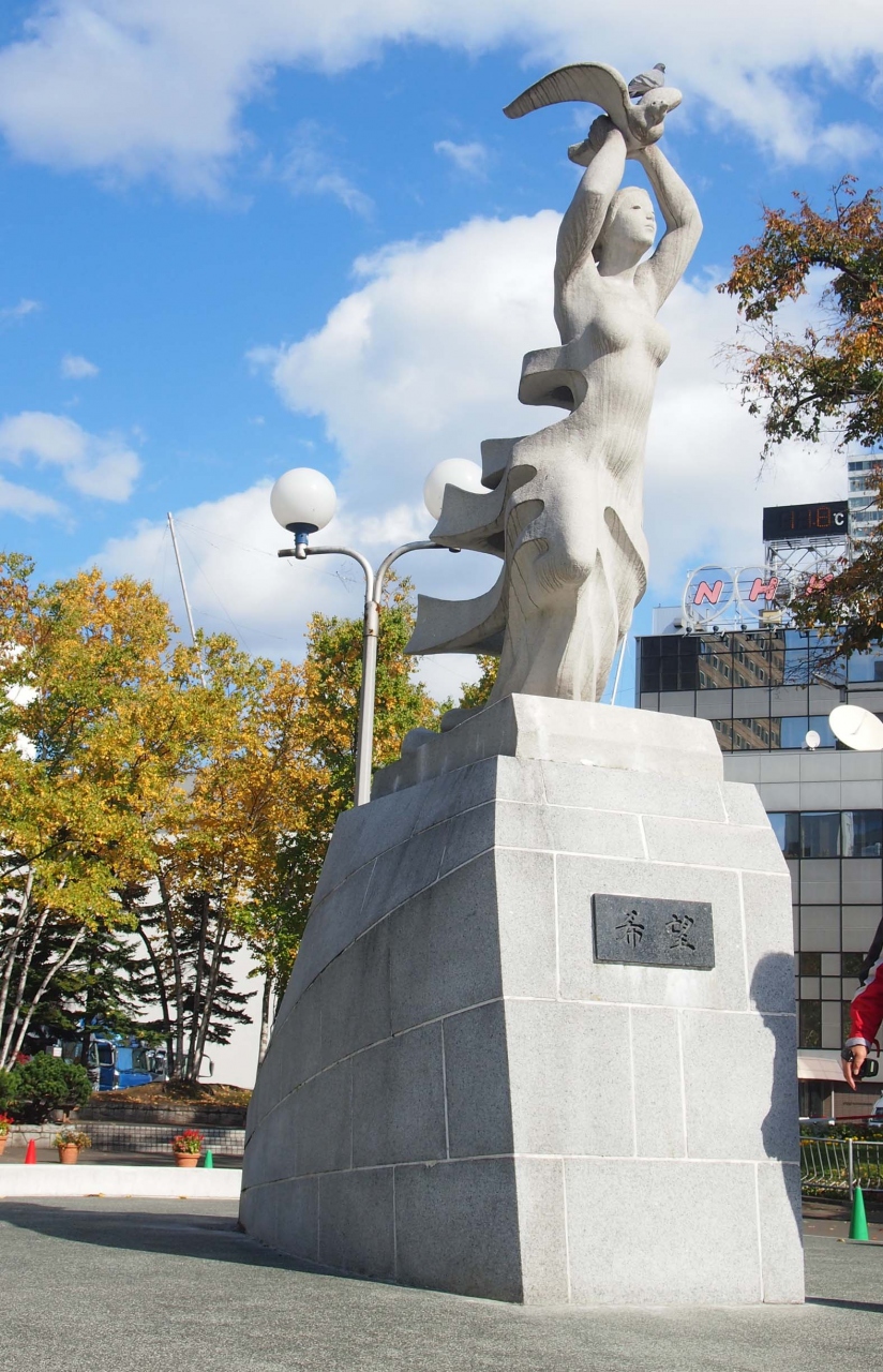 【希望】の像はさっぽろ市内に幾つか設置されている山内壮夫氏の作品です。札幌市民ホール前の広場に設置されている像で目立つ存在です。石像ながら流れや動きを感じさせる像です。外国の方も良く写真を撮っています。