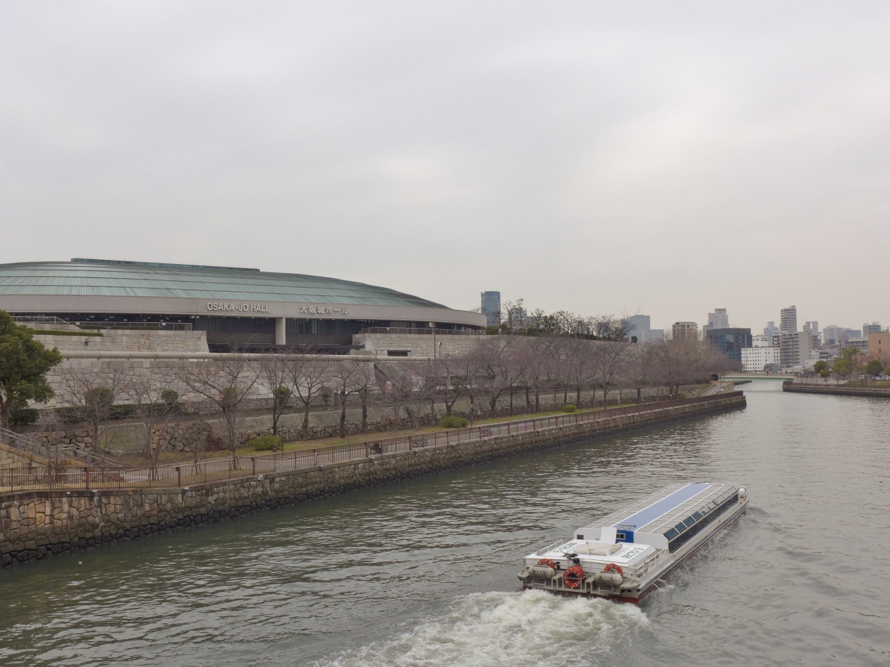 大阪城の景観を損なわない配慮なのか、穏やかな色合いの楕円形のドーム屋根が載り、建物の周囲は石垣で囲まれていました。