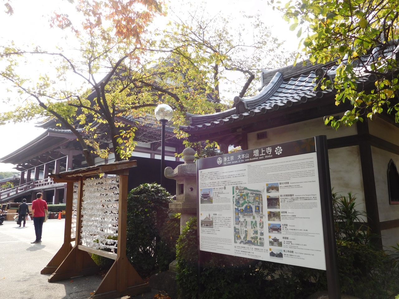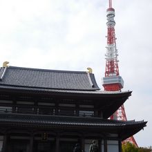 徳川将軍家と深いゆかりのある、600年の歴史のあるお寺です。三解脱門をくぐり境内に入り、階段の下から大殿を見上げると、ちょうど背景の右奥に東京タワーが入り、絶好の撮影スポットとなるので、多くの観光客が写真を撮っていました。