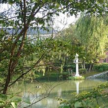 明治村5丁目の金沢監獄正門をくぐると、池のほとりに小さな白い燈台があります。広島湾内の小さな島である、小那沙美島(現在の絵の島)に明治37年建造された燈台です。あまりに小さくて、見逃してしまいそうでした。