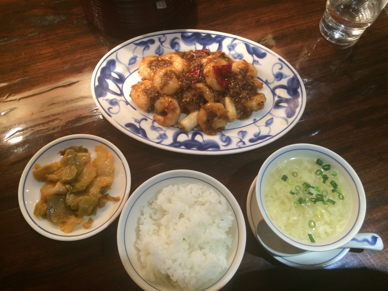 今日はエビチリランチを、たっぷりの海老を挽肉と醬で炒めると言う珍しいエビチリ