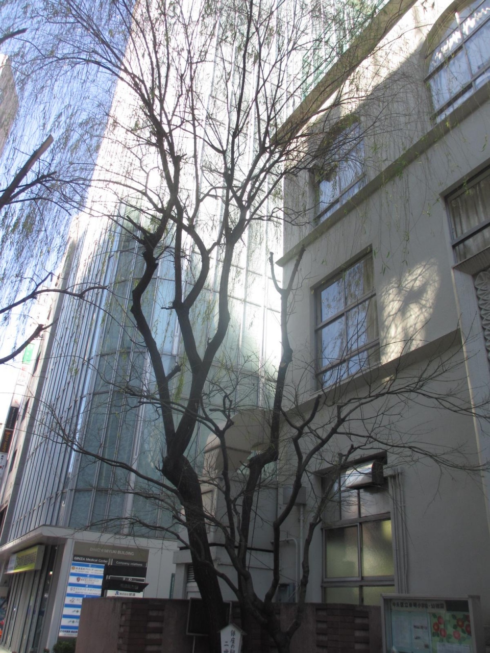 泰明小学校の前左側にあります。すぐ横には島崎藤村・北村透谷記念碑があります。なんとか銀座の柳を守ろうとして一世の木から挿し木により生まれた一本のようです。木だけでなく説明板もつけていただいたほうがよいと思います。