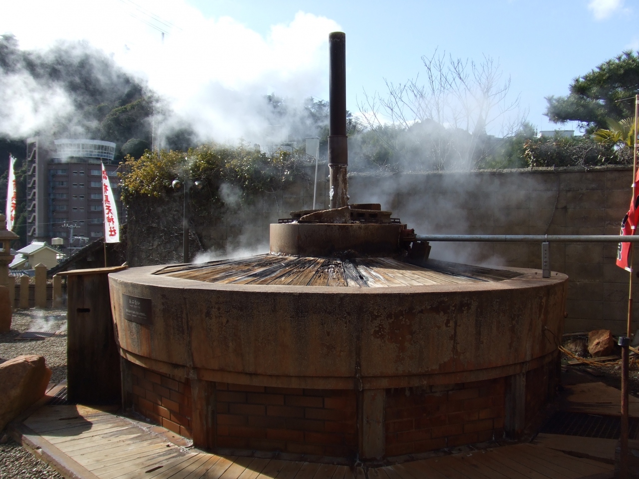 天神泉源は、京都の北野天満宮を分けて祭られた有馬天神社の境内にあります。有馬温泉の泉源の中でも代表格。泉質は、鉄分と塩分濃度の高い茶褐色の「金泉」。地中では無色透明だけど空気にふれて酸化すると茶褐色に変わるそうです。高温で湯気がもくもくと出ていました。