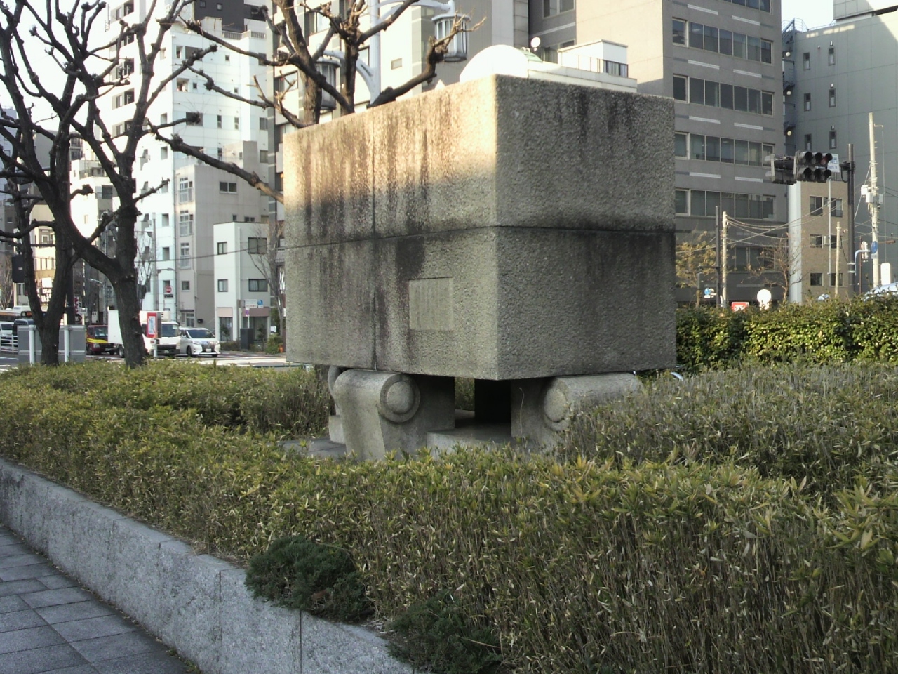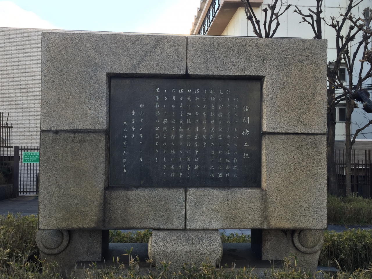 勝鬨橋之記の記念碑は、勝鬨橋のたもとの晴海通り沿いの歩道上にあります。