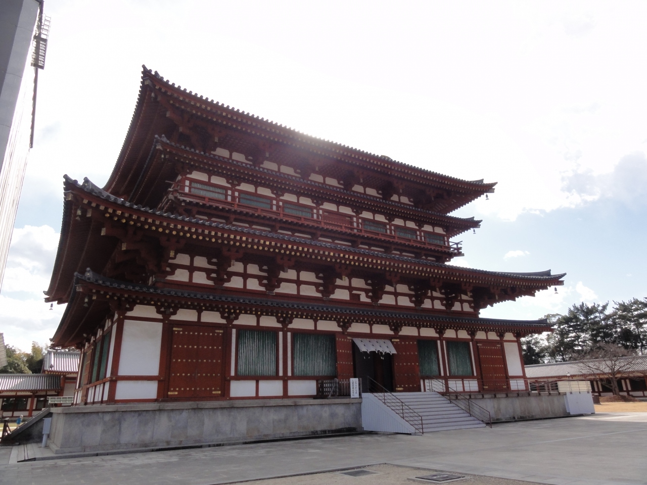 近鉄西ノ京駅からすぐ。薬師寺は法相宗[ほっそうしゅう]の大本山。ユネスコ世界遺産に登録されていて、広い青い空に朱色が映えるきれいなお寺。とても広大な敷地でした。唐招提寺と隣接しているのであわせて見学するのが良い。修復中の所が多かった。