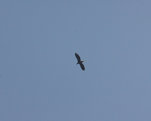 私が初めて涸沼でオオワシを見た時の印象は、低空を畳がゆったりと飛んでいるような迫力満点の印象でしたが、その後は低空を飛翔するオオワシを見る機会に巡り合っていません。今年もオオワシの低空飛行を期待したのですが、今日はかなり高い位置を飛んでいて、おまけに太陽に近い位置だったので怖くてカメラを向けられませんでした。ようやく太陽から離れたのでシャッターを切ったら、距離も遠くてなんとか証拠写真という程度でした。 その後、オオタカやノスリなどの猛禽類も出て楽しませてくれました。芦原でもオオジュリンやホオジロも出て楽しませてくれました。来年も是非リベンジしたいです。