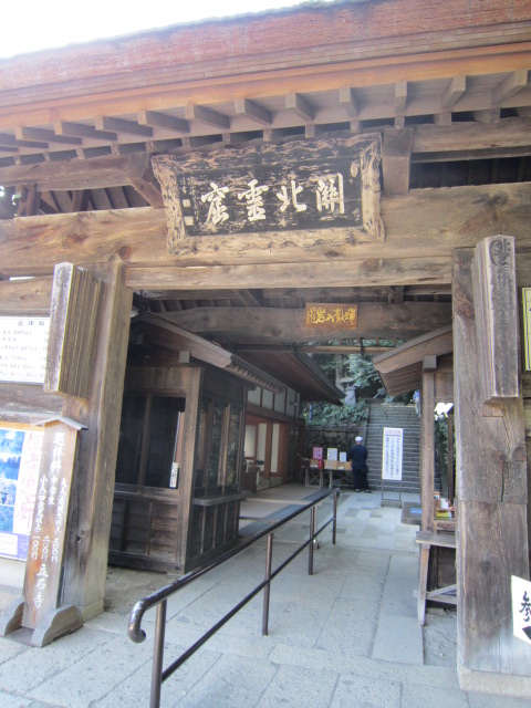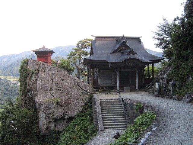 大きな岩の弥陀堂、そこから見える仁王門をくぐり抜け、石垣を見ながら上って行くと、視界が開けた先に開山堂と納経堂が断崖を背に並んで建てられていて、感動が込み上げてきながら近づいて、その脇から五大堂への通路を登りました。