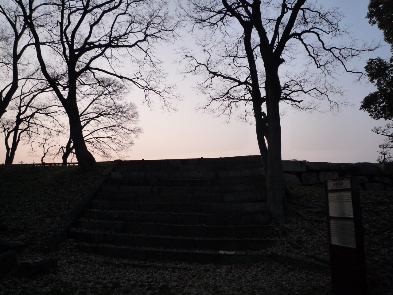 伏見櫓の跡は大阪城公園の茂みの中にあって今は石段が残るだけです。
