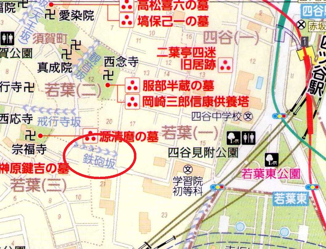 鉄砲坂は、赤坂離宮の西、学習院初等科の裏手にある坂です。