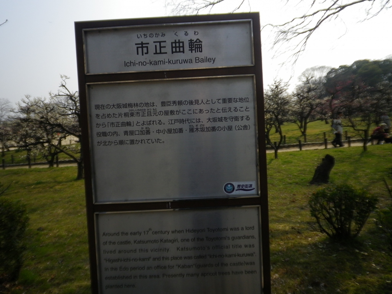 大阪城の梅林に案内板がありました。片桐旦元も屋敷があったとされる場所のようです。片桐旦元は市正(いちのかみ)と呼ばれていたため市正曲輪と呼ばれるようになったそうな。尚、曲輪(くるわ)とは城郭内にある一定区画を分かつ区域と定義されています。