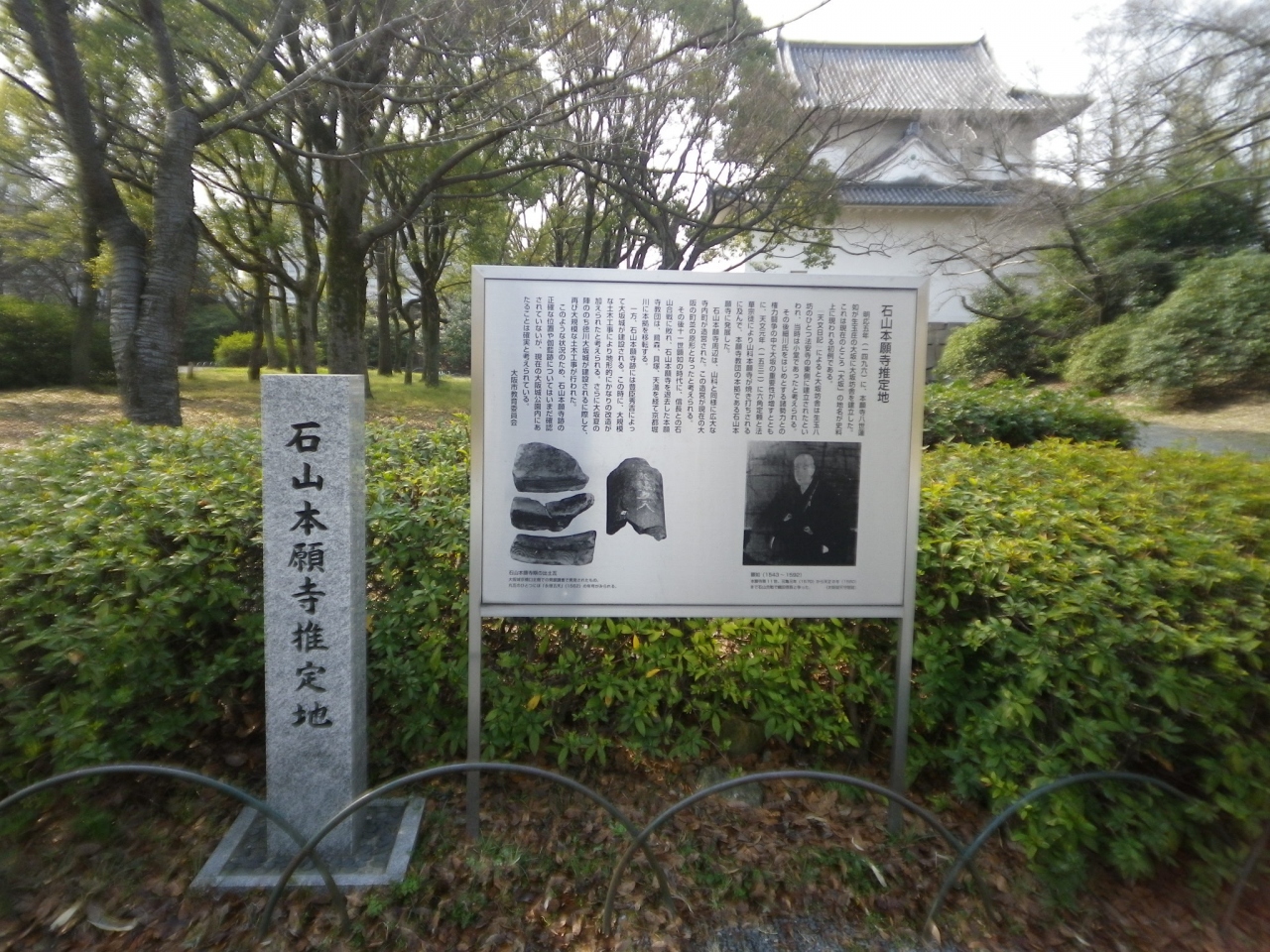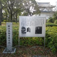 実際の場所は良くわからない為推定地となっていますね。もっともこの付近に会ったことは間違いないのでしょう。信長が滅ぼしそこに秀吉が城を建てたということになります。尚、石山本願寺との戦いは11年続いたそうです。信長がこだわったのはこの立地と言われています。