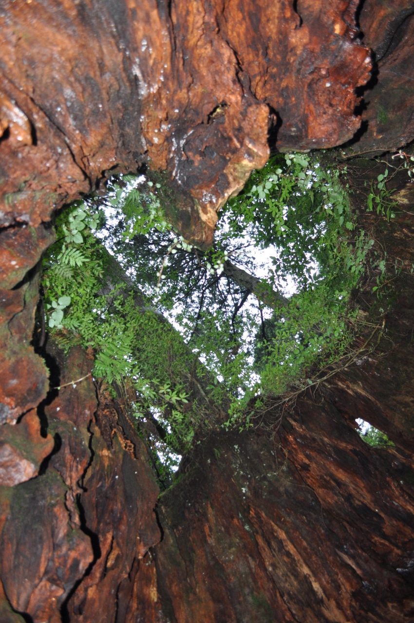荒川登山口から3時間ほどでたどりつきます。樹齢3000年ほどの杉の木だったとの事ですが、伐採され今では根元の切り株部分しか残っていません。切り株の中は空洞になっており、中に入ることができます。足元には小川が流れており、注意が必要ですが、しゃがんで上を見上げるとハート型に穴が開いているのが見れます。