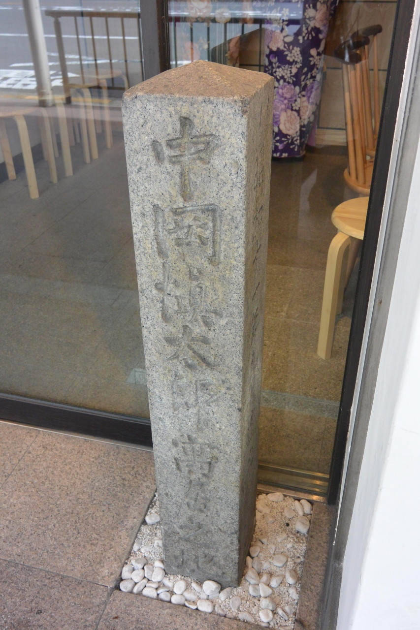 三条と四条の間の河原町通りにあります。東側の歩道です。石碑があるだけですが、中岡が坂本龍馬とともに暗殺された近江屋や、龍馬が居住していた酢屋は目と鼻の先。なんだか、龍馬や中岡がこのあたりを歩いている姿が思い浮かんできます。