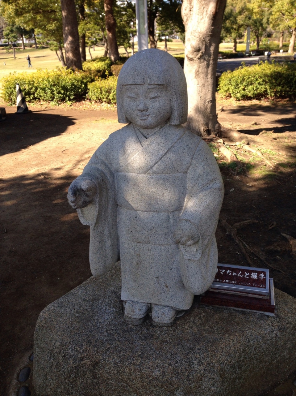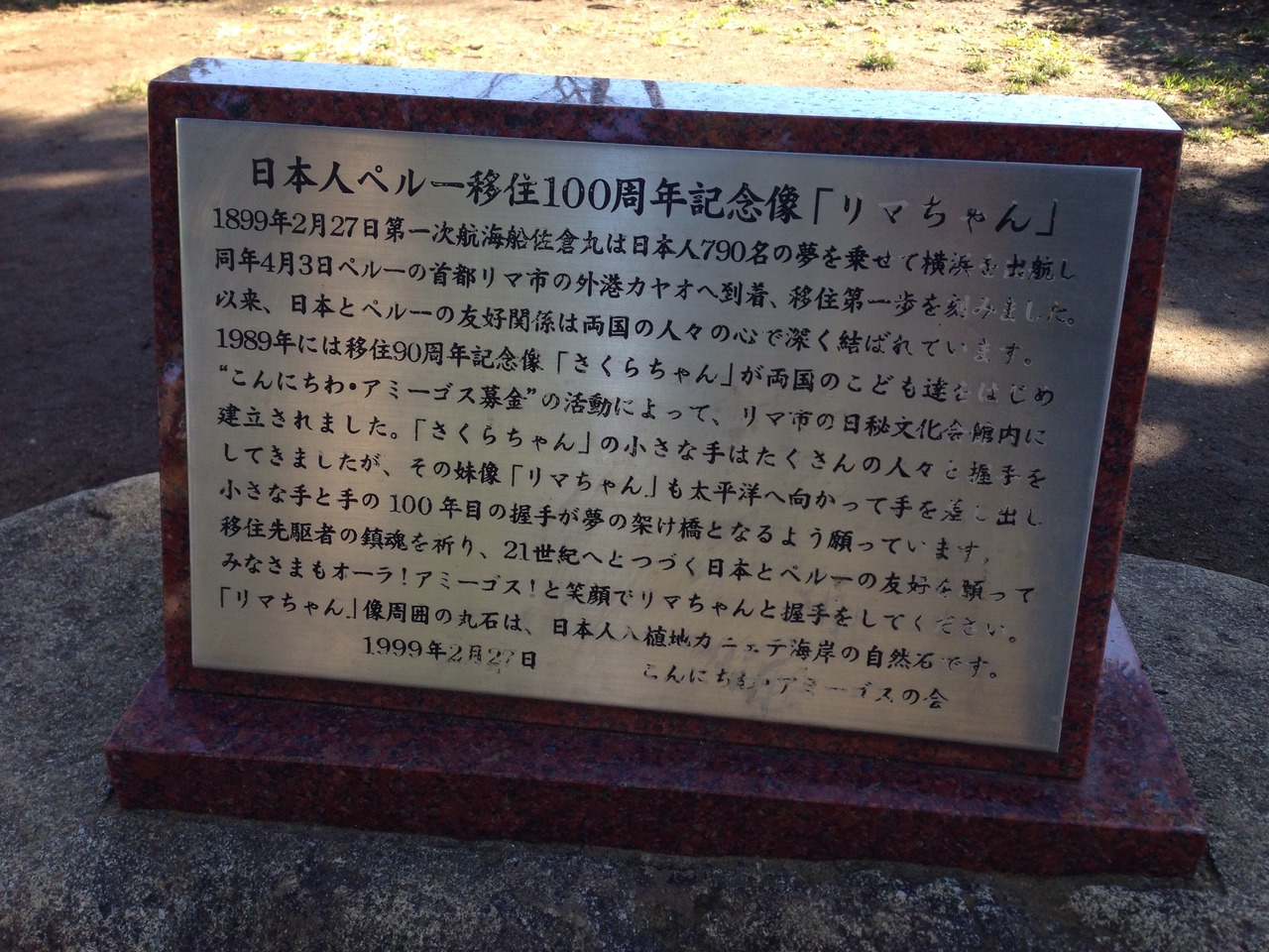 臨港パーク内にある 日本人ペルー移住100周年に建てられた像だそうです。リマちゃんは右手を差し出して立っていました。ペルーの方向を向いてるそうです。みんな握手をしているので 右手はツルツル、もちろん握手しました。