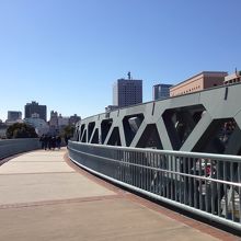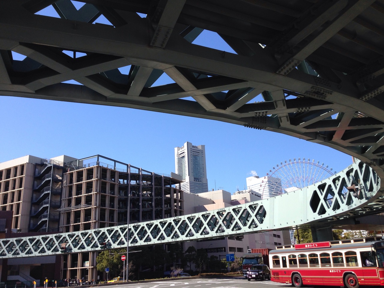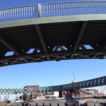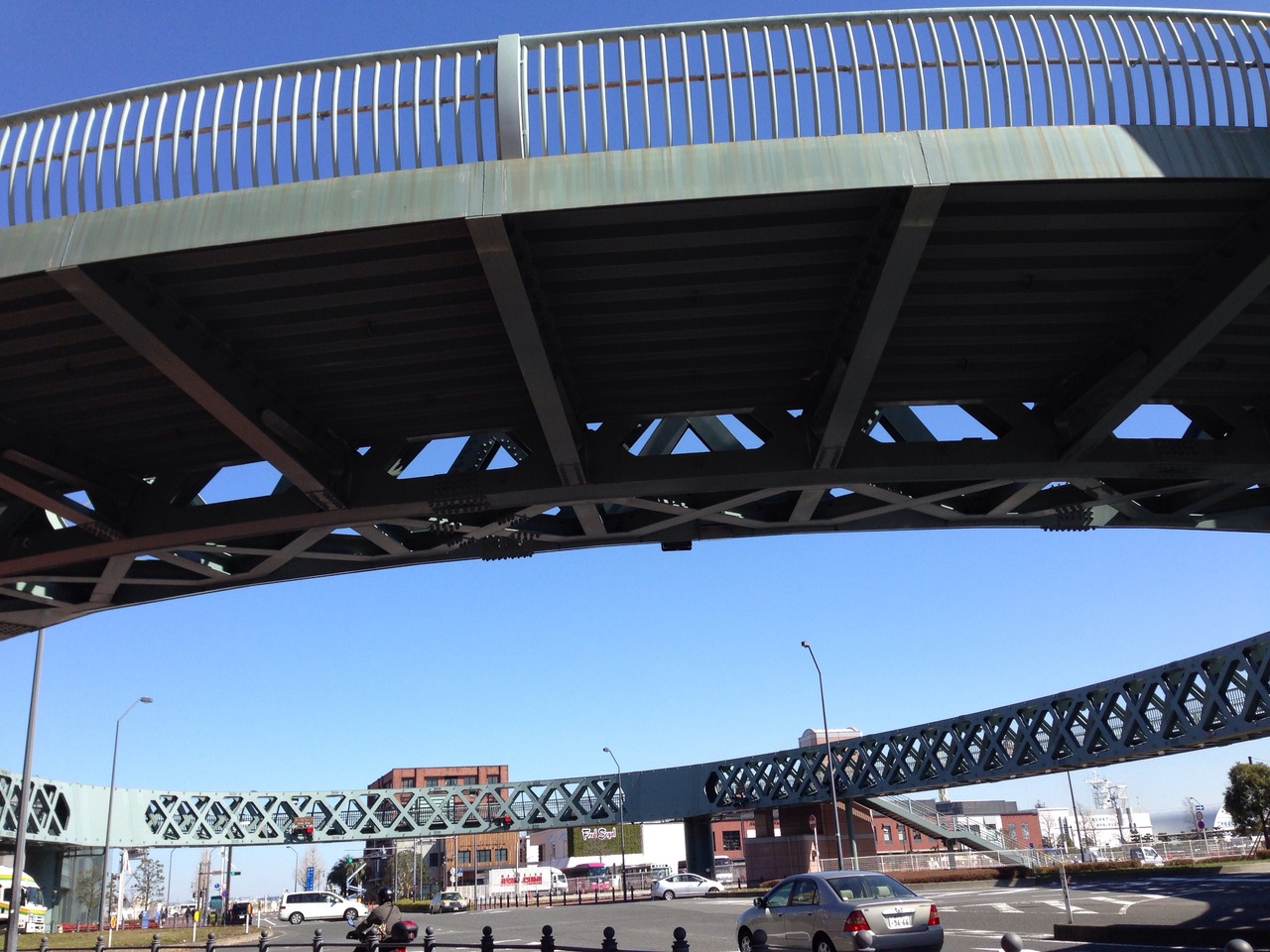 ワールドポーターズの横にある 歩道橋。この交差点には歩行者様の信号がないのでここを利用します。