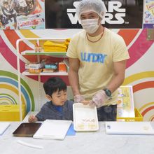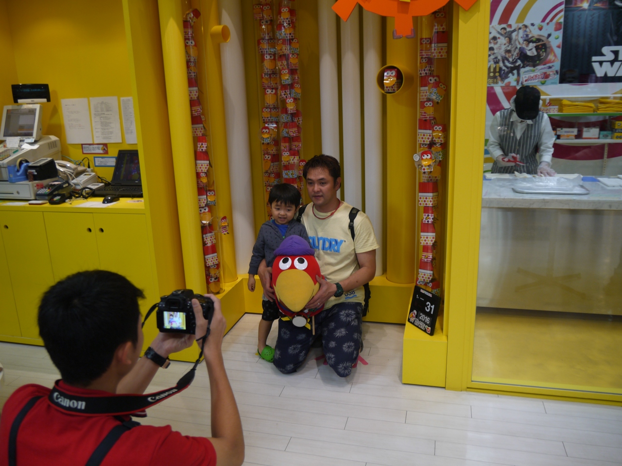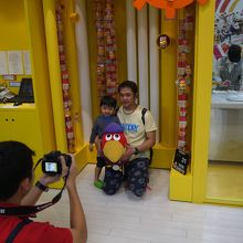 店内はお土産コーナーの奥に体験ブースが用意されていて、ガラス越しに写真を撮ることもできます。子供がまだ小さいこともあってパパと一緒に体験させてもらいました。