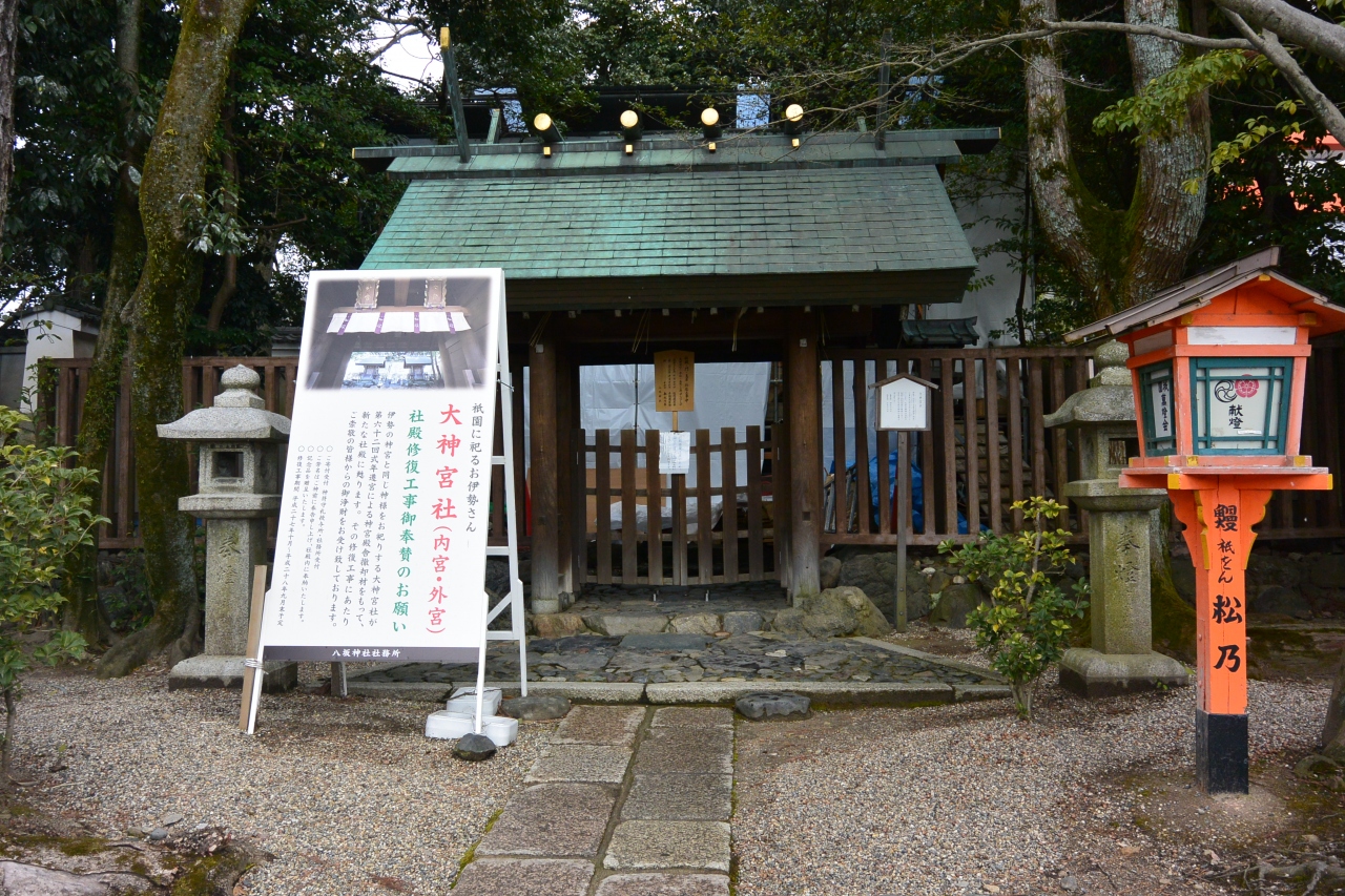 現在修復工事中で社殿はなく、神様は本殿に遷っておられ、参拝も本殿のほうでするようになっています。看板に「第六十二回式年遷宮による神宮殿舎撤却材をもって、新たな社殿に蘇ります」とありましたが、伊勢神宮で使われていた材で八坂神社の大神宮社を造るということでしょうか。