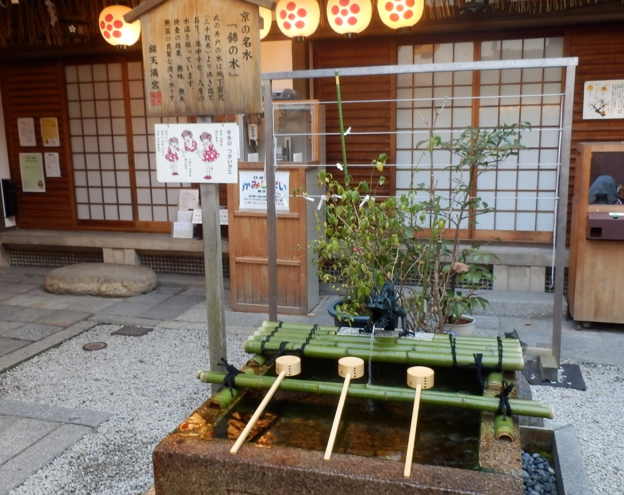 京都の錦天満宮は、京都でも最もにぎやかな観光地新京極通に面して鎮座、阪急電鉄京都線河原町から徒歩5分、境内に井戸があり地下百尺(30M)から水が湧きだして降り常時17~18度の水温がたもたれているとされています、神社設置の立札には、検査の結果無味,無臭、無菌だと記されています、柄杓で一杯頂戴しました、なんとなく甘い感触がよかったです、参考資料**現地に神社が設置した立札