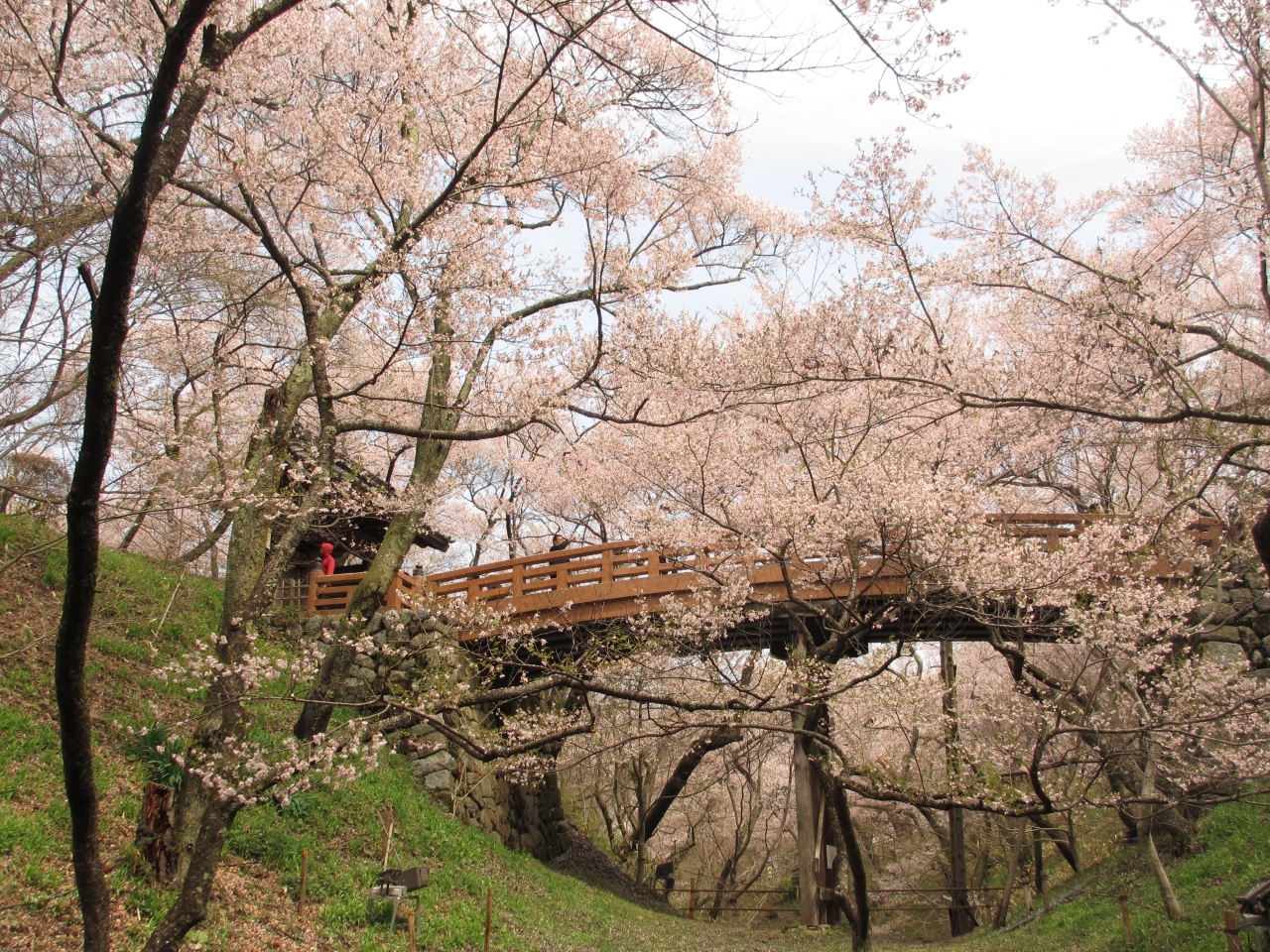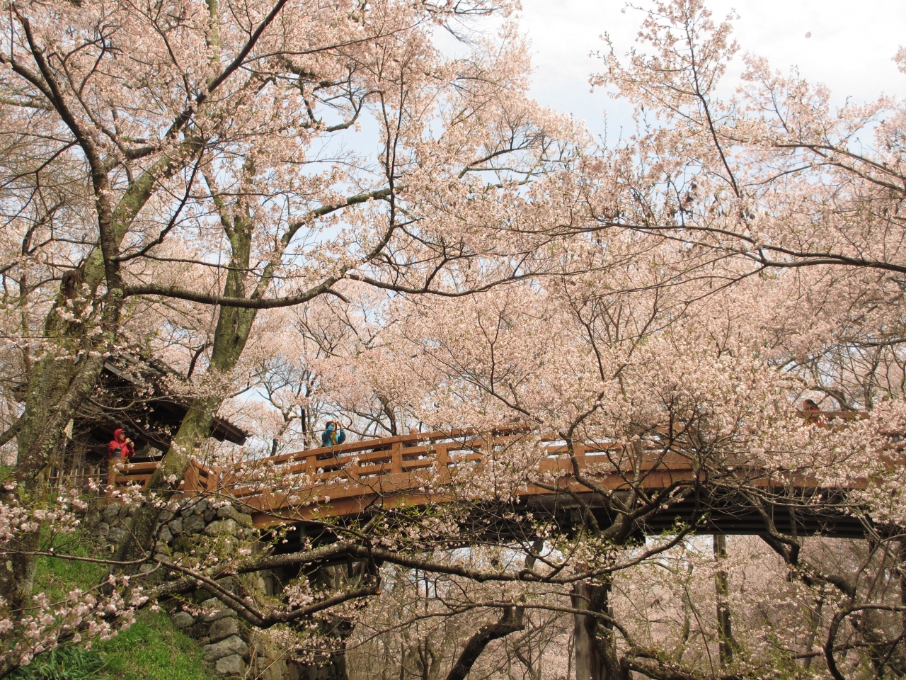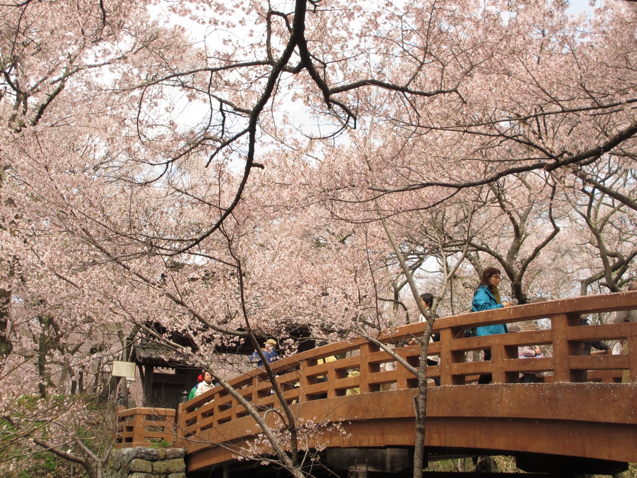 高遠城址公園の中にある橋です。桜の季節には、この橋の上や周囲には満開になった桜の木や枝がせり出し、素晴らしい景色を作り出してくれます。多くの人が橋のたもとから写真を撮っています。さらに階段を下り、下から見た橋を入れ、桜の写真を撮るカメラマンも多く見られます。高遠城址公園のカメラスポットです。